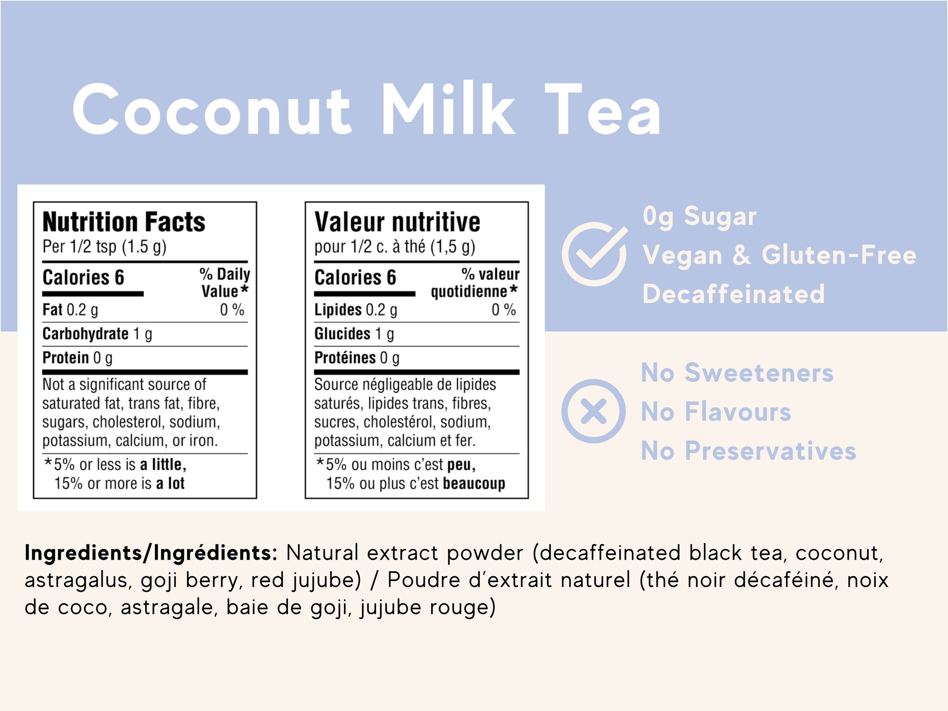 This decaffeinated Coconut Milk Tea is fortified with the nourishing power of astragalus root, goji berries, and red jujube to create a blissful experience for your body and soul to enjoy any time of day. It's dissolvable for ultimate convenience and versatility - so you can enjoy it hot or cold with milk or even use it to boost a smoothie or chia seed pudding.