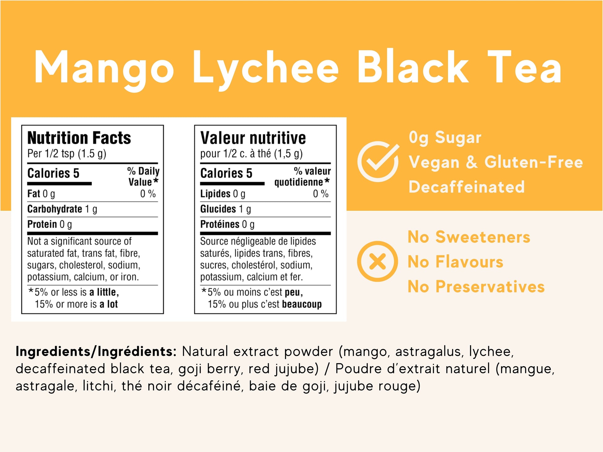 Sip away in with this smooth black tea with sweet notes of real mango and lychee. With the nutritional powerhouse of goji berries, red jujube and astragalus root, this tea elixir nourishes your body and promotes a balanced, calm wellbeing. Enjoy any time of day knowing you can unwind instantly with this decaffeinated blend!