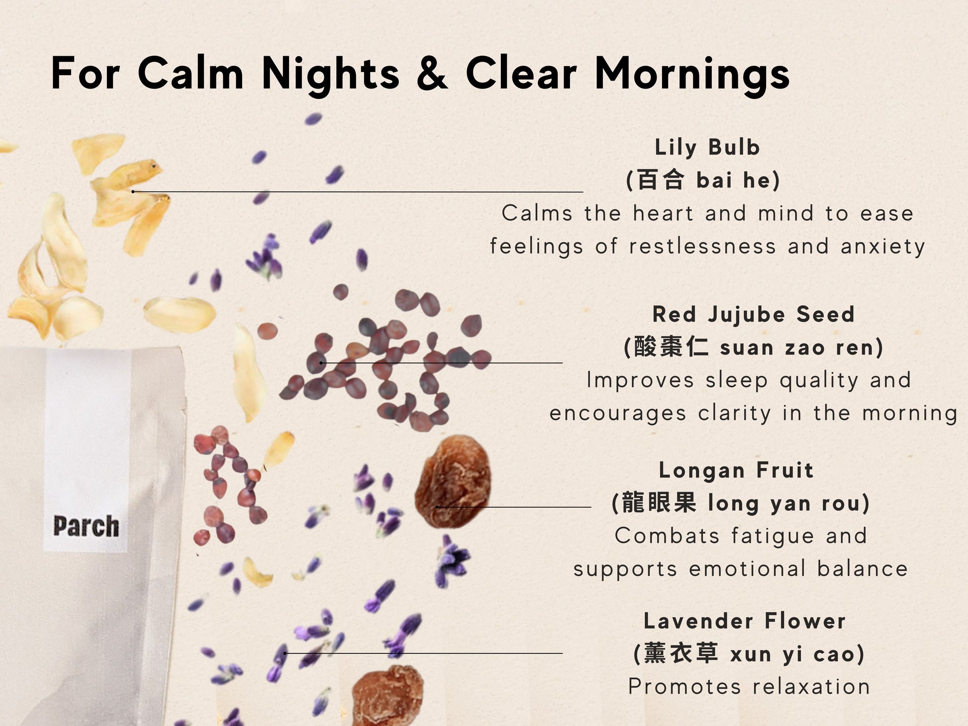 • Red Jujube Seed (Suan Zao Ren): Celebrated for its sleep-enhancing benefits, this seed quiets the mind, improves sleep quality, and encourages mental clarity and focus in the morning.