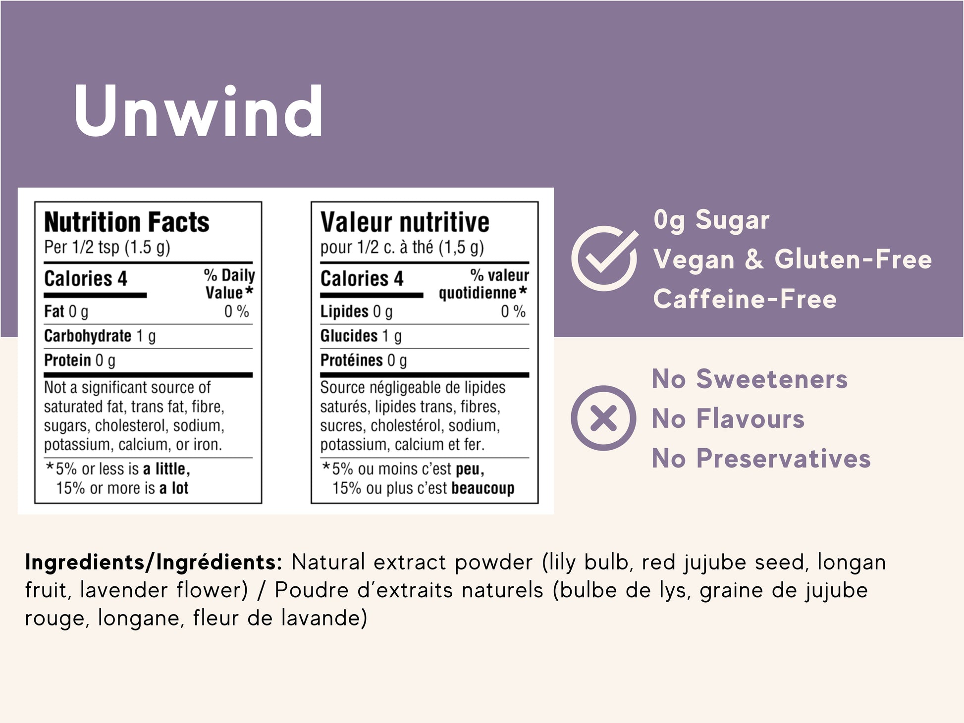 Sip on Unwind before bedtime and experience the harmony of restful sleep and a bright, balanced start to your day.