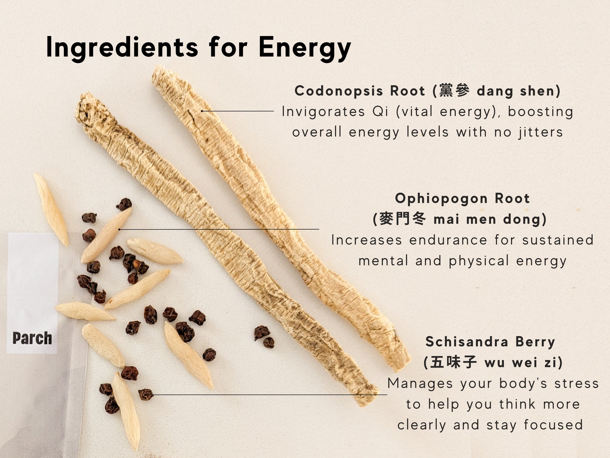 Invigorates Qi (vital energy) boosting overall energy levels to help you feel more awake and active.